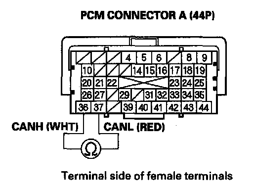 4. Measure resistance between PCM connector terminals A36 and A37.