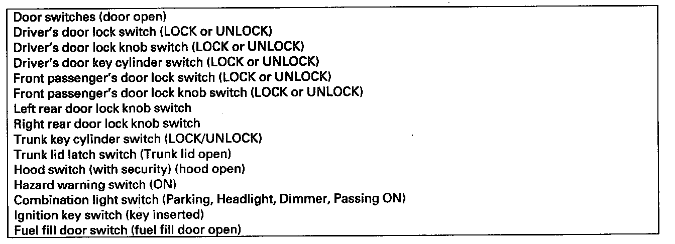 When the ignition switch is turned ON (II), the MICU, gauge control module, immobilizer-keyless control unit-receiver, and PCM wake up at the same time without "talking" to each other through the communication lines. When any switch in the multiplex integrated control system is turned on, it wakes up its related control unit which, in turn, wakes up the other units. After confirming the sleep mode, look in the following table for the switch most related to the problem. Operate that switch and see if its control unit wakes up.