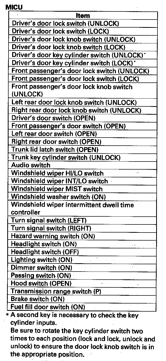 11. The following tables list the circuits that can be checked in Test Mode 2. Operate the switch that is most closely related to the problem. If the circuit is OK, the ceiling light will blink once. If the circuit is faulty, there will be no indication.