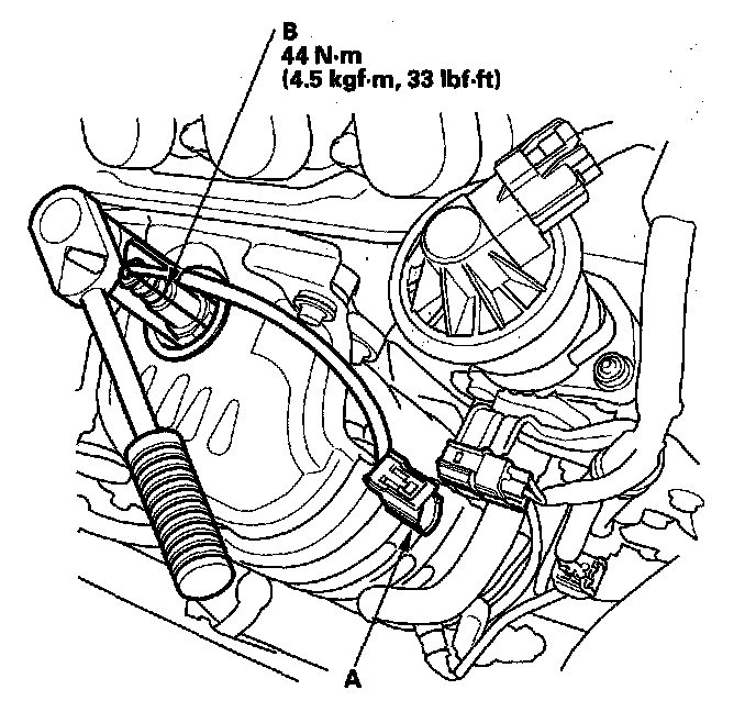 1. Disconnect the A/F sensor 4P connector (A), then remove the A/F sensor (B).
