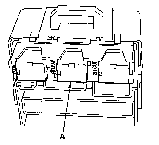 2. Remove the under-dash fuse/relay box, then remove PGM-FI main relay 2 (FUEL PUMP) (A) from the under-dash fuse/relay box.
