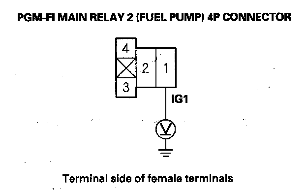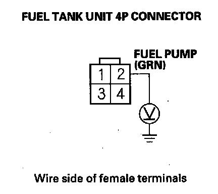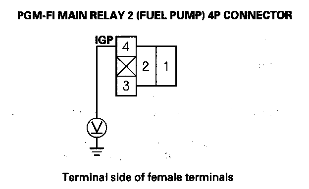 12. Measure voltage between PGM-FI main relay 2 (FUEL PUMP) 4P connector terminal No. 1 and body ground.