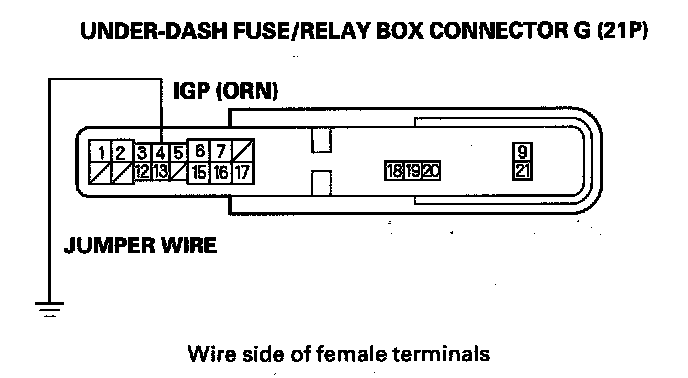 10. Connect under-dash fuse/relay box connector G (21P) terminal No. 4 to body ground with a jumper wire.