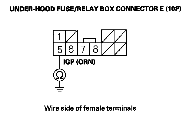 11. Check for continuity between under-hood fuse/relay box connector E (10P)terminal No. 5 and body ground.