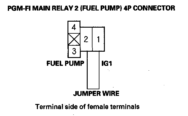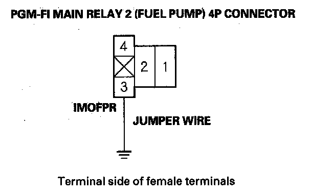 14. Connect PGM-FI main relay 2 (FUEL PUMP) 4P connector terminal No. 3 to body ground with a jumper wire.