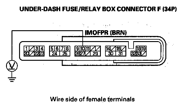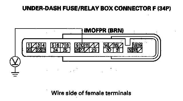 27. Turn the ignition switch ON (II), and measure voltage between under-dash fuse/relay box connector F (34P) terminal No. 10 and body ground within 2 seconds.
