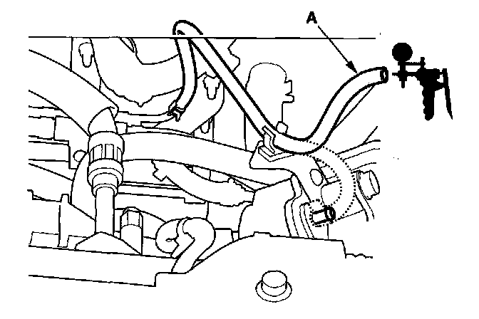 2. Connect a vacuum pump/gauge, 0-30 in.Hg, to the hose (A) from fuel pressure regulator P1, and apply 67.7 kPa (20 in.Hg, 508 mmHg) of vacuum.