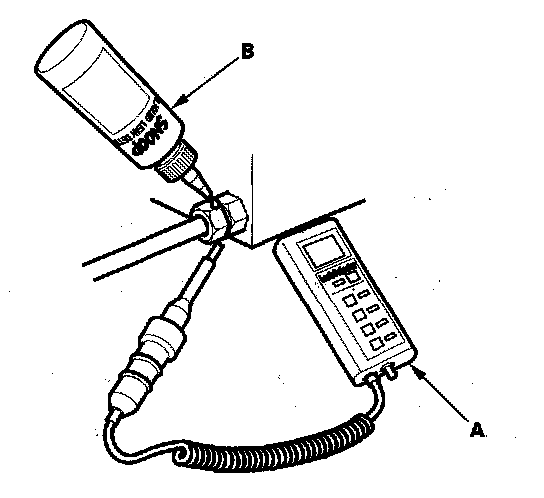 6. Within 1 minute, check for any damaged lines with a leak detector (A) (Matheson Leak Hunter Plus, model number 8066 or Snoop Soap Suds (B)).