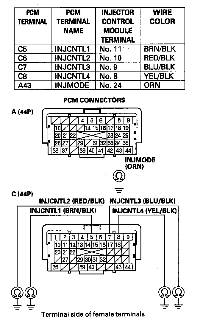 11. Check for continuity between body ground and the PCM connector terminals (see table).