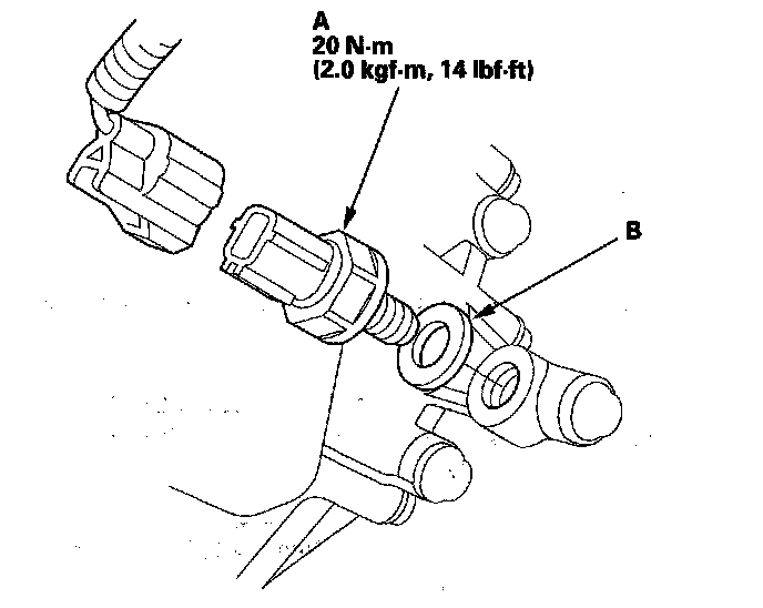 5. Install a new 3rd clutch transmission fluid pressure switch with a new sealing washer (B), and tighten the switch to the specified torque by turning the metal part, not the plastic part.