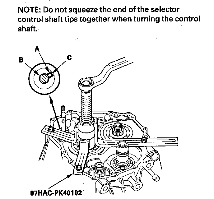 4. Align the spring pin (A) on the selector control shaft (B) with the transmission housing groove (C) by turning the selector control shaft with the detent plate.