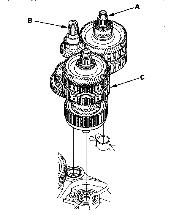 8. Remove the mainshaft subassembly (A), the countershaft subassembly (B), and the secondary shaft subassembly (C) together. If the reverse selector hub is removed by hand, remove the 4th-5th gear and the needle bearings, and remove the mainshaft subassembly. Then remove the countershaft subassembly and the secondary shaft subassembly together.