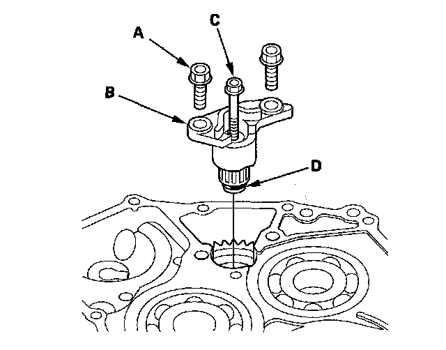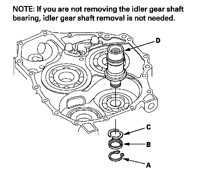 1. Remove the snap ring (A), the cotter retainer (B), and the coffers (C) from the idler gear shaft (D), then remove the idler gear shaft. Do not distort the snap ring.