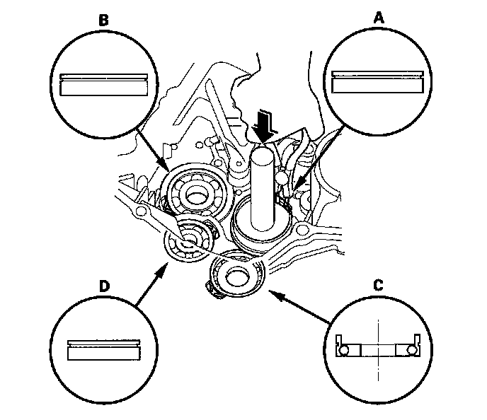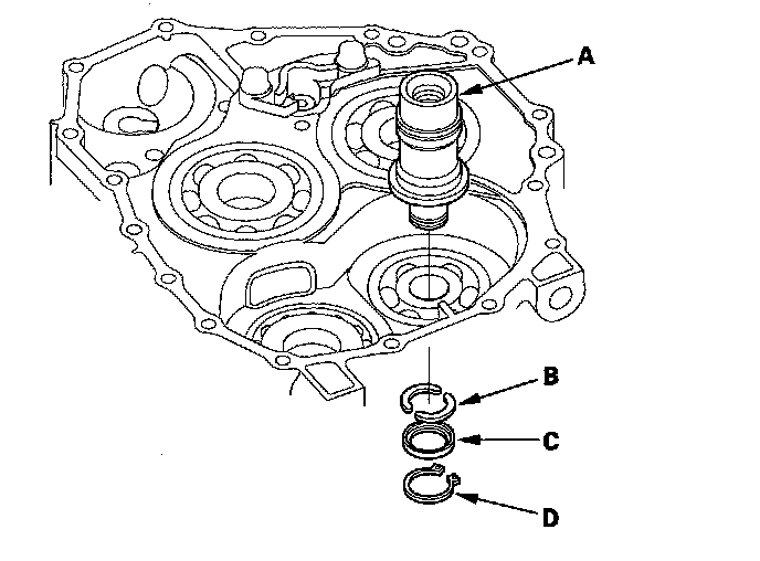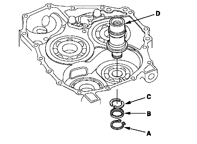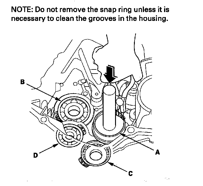 2. To remove the mainshaft bearing (A), the countershaft bearing B, the secondary shaft bearing (C), and the idler gear shaft bearing (D) from the transmission housing, expand each snap ring using snap ring pliers, then push the bearing out using the driver and the attachment.