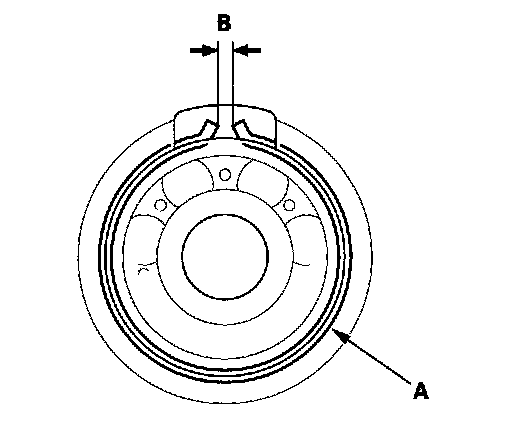 4. After installing the bearings check that the snap rings (A) are seated in the bearing and housing grooves, and that the ring end gaps B, are 0 - 7 mm (0 - 0.28 in.)
