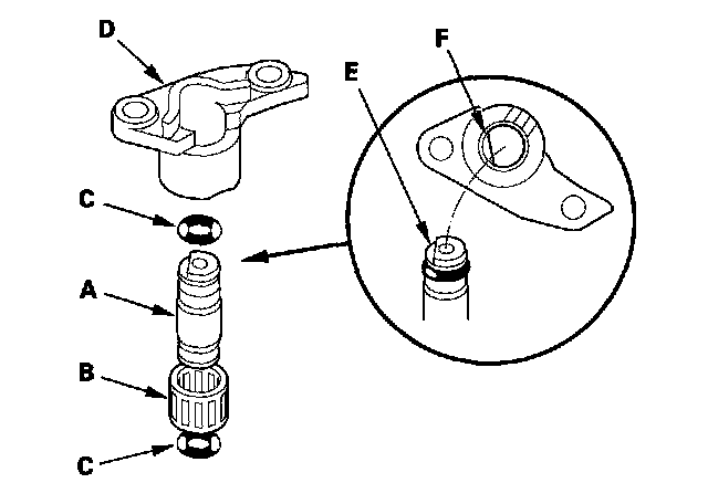 2. Assemble new O-rings and needle bearing on the reverse idler gear shaft, then install the reverse idler gear shaft in the reverse idler gear shaft holder (D). Align the D-shaped (E) cut out of the shaft with the D-shaped area (F) of the holder.