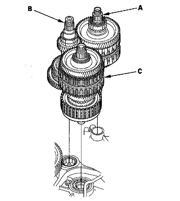 5. Join the mainshaft subassembly (A), the countershaft subassembly (B), and the secondary shaft subassembly (C) together, and install them in the torque converter housing.