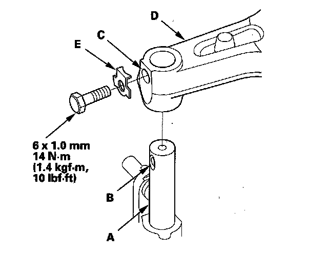 8. Install the shift fork and the reverse selector together on the shift fork shaft and the countershaft. Secure the shift fork to the shift fork shaft with the lock bolt and a new lock washer (E), then bend the lock tab of the lock washer against the bolt head.