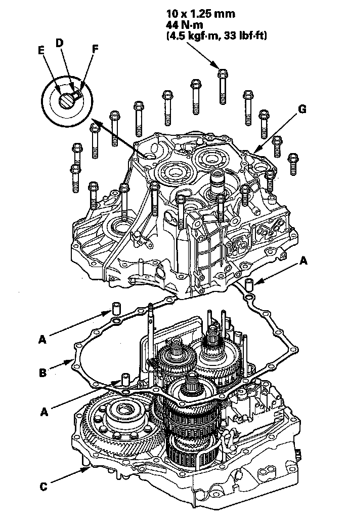 15. Install the transmission housing mounting bolts, and tighten the 19 bolts to 44 N-m (4.5 kgf-m, 33 lbf-ft) in two or more steps in a crisscross pattern.