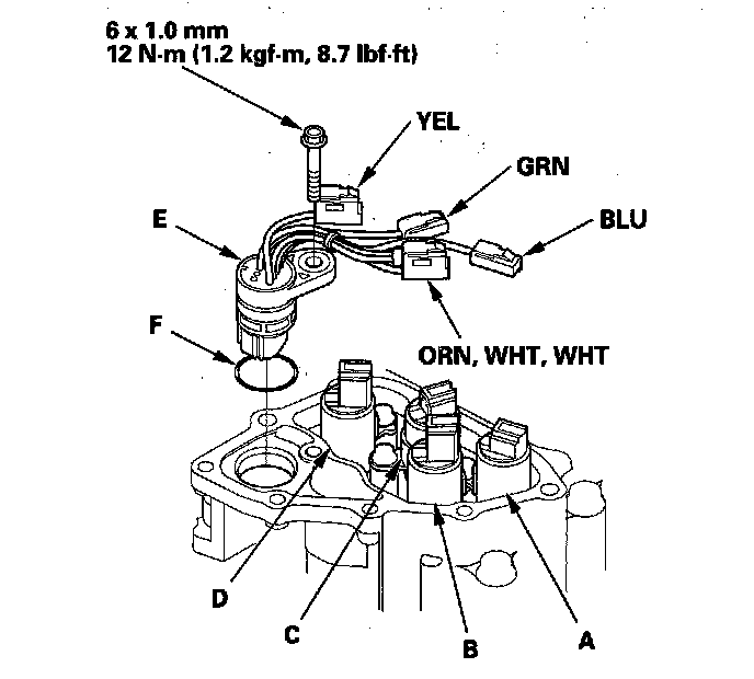 16. Install the shift solenoid harness connector (E) in the transmission housing with a new O-ring (F)