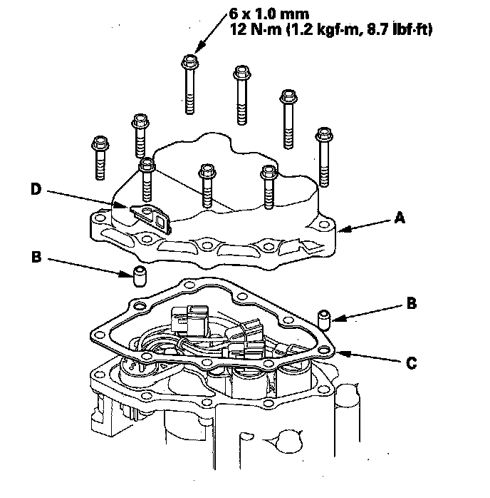 1. Remove the shift solenoid valve cover (A), the dowel pins (B). the gasket (C), and the harness clamp bracket (D).