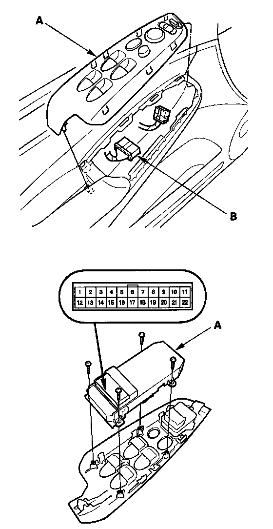 2. Disconnect the 22P connector (B) from the power window master switch.