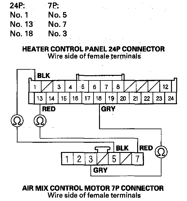 9. Check for continuity between the following terminals of the heater control panel 24P connector and the air mix control motor 7P connector.