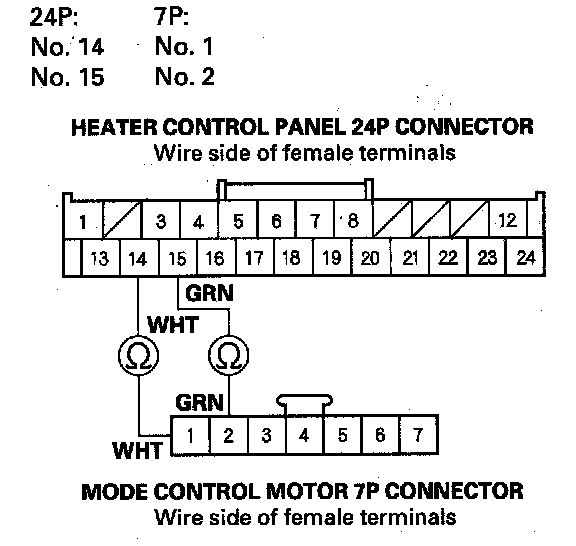 7. Check for continuity between the following terminals of the heater control panel 24P connector and the mode control motor 7P connector.