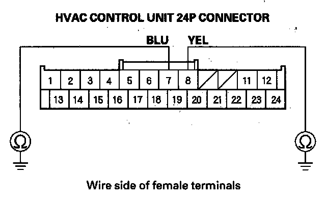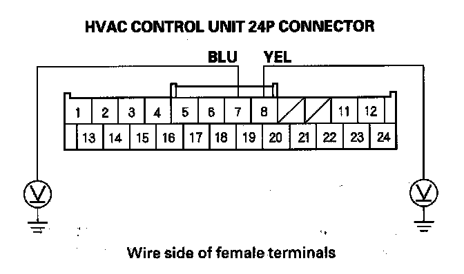 21. Measure the voltage between body ground and the HVAC control unit 24P connector No. 7 and No. 8 terminals individually.