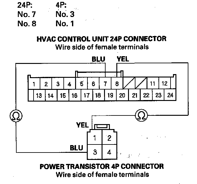 19. Check for continuity between the following terminals of the HVAC control unit 24P connector and the power transistor 4P connector.