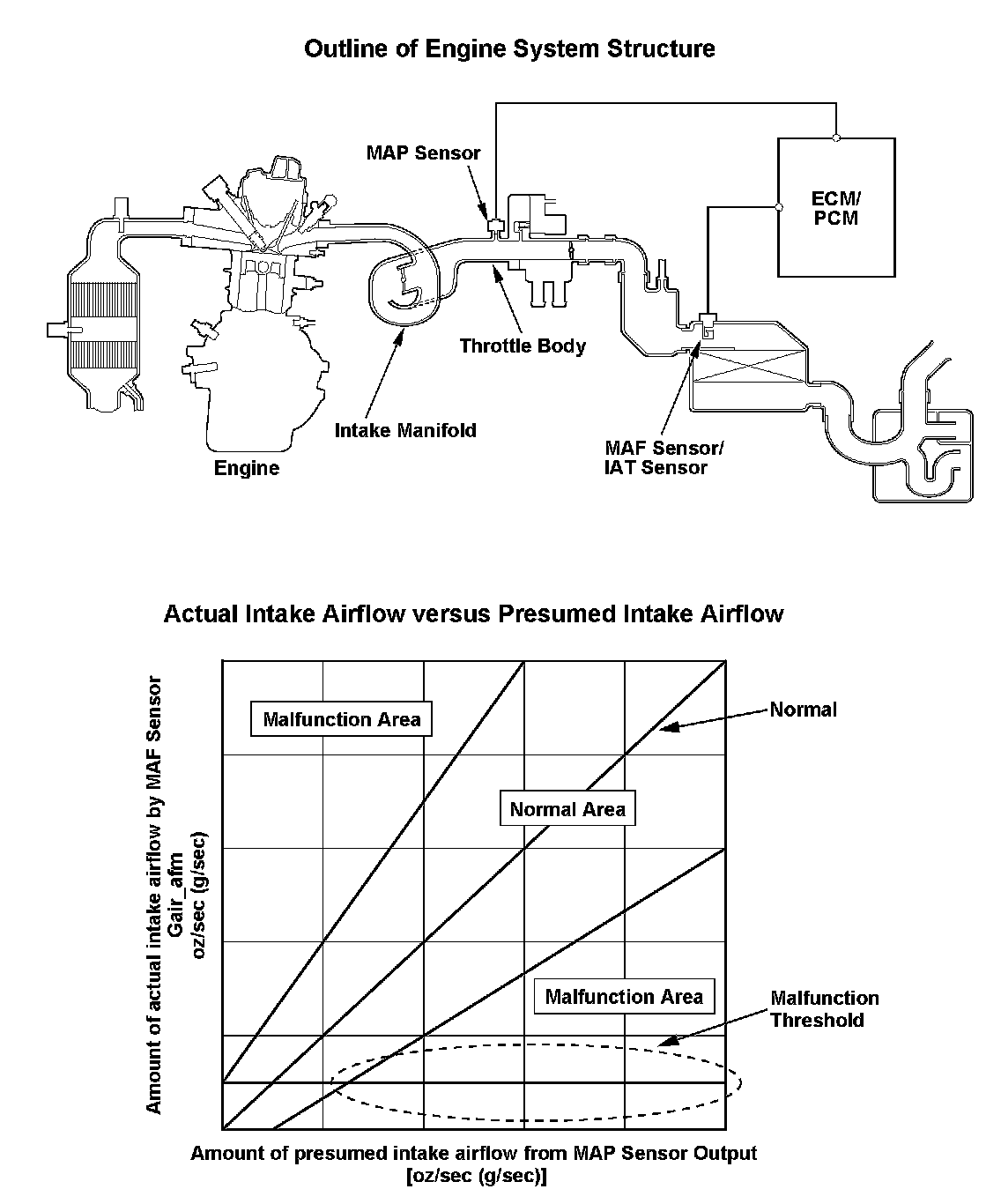 The ECM/PCM compares the MAF sensor output (amount of intake airflow) and the amount of intake airflow calculated from MAP sensor output. If their difference is too large (in the malfunction area), the ECM/PCM detects a malfunction and a DTC is stored.