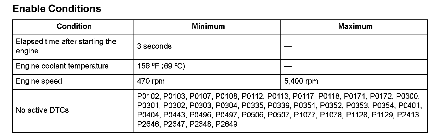 The difference between the amount of intake air measured by the MAF sensor and the amount of intake air calculated from the MAP sensor output is out of the normal area for at least 5 seconds.