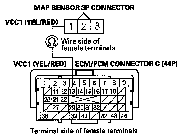 11. Check for continuity between ECM/PCM connector terminal C13 and MAP sensor 3P connector terminal No. 1.