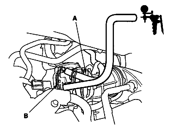 6. Disconnect the vacuum hose (A) from the EVAP canister purge valve (B) in the engine compartment, and connect a vacuum pump/gauge, 0-30 in.Hg, to the hose.