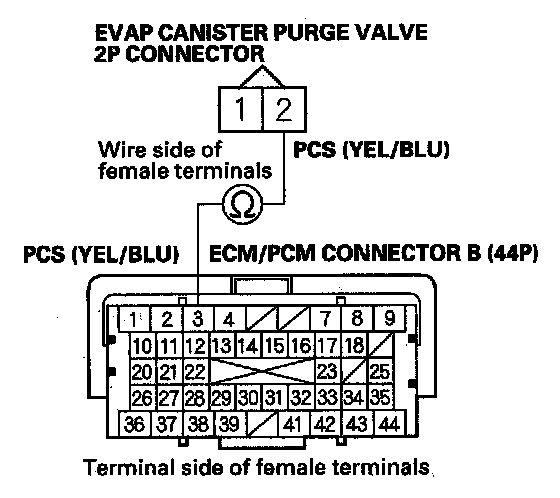 21. Check for continuity between ECM/PCM connector terminal B3 and EVAP canister purge valve 2P connector terminal No. 2.