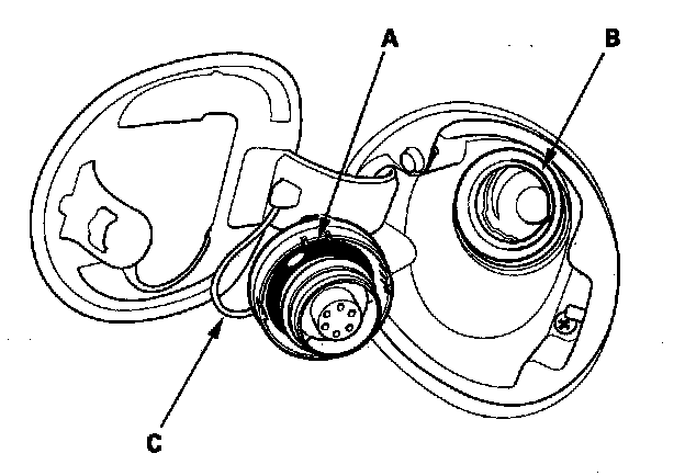 2. Check the fuel fill cap seal (A) and the fuel fill pipe mating surface (B). Verify that the fuel fill cap tether cord (C) is not caught under the cap.