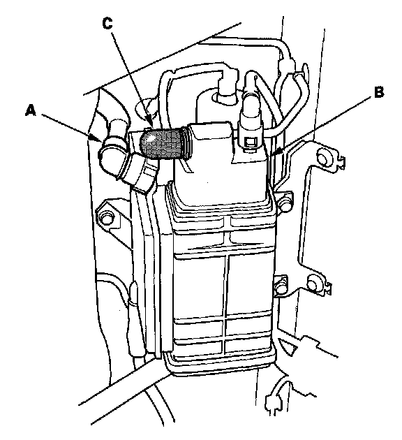 15. Disconnect the fresh air hose (A) from the EVAP canister (B), and plug the EVAP canister port (C).