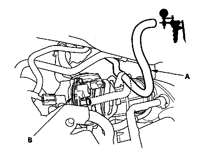 9. Disconnect the vacuum hose (purge line) (A) from the EVAP canister purge valve (B) in the engine compartment, and connect a vacuum pump/gauge, 0-30 in.Hg, to the vacuum hose as shown.