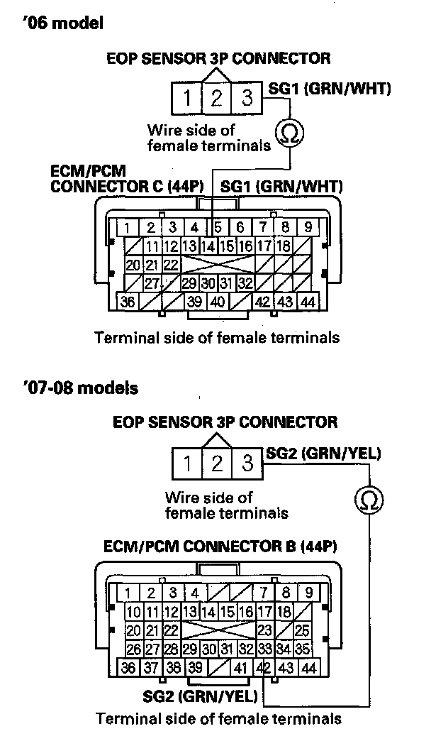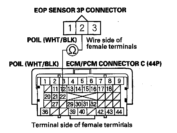 17. Check for continuity between ECM/PCM connector terminal C22 and EOP sensor 3P connector terminal No. 2.
