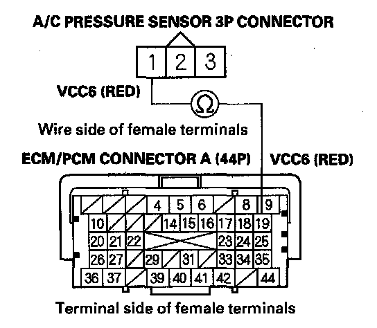 17. Check for continuity between A/C pressure sensor 3P connector terminal No. 1 and ECM/PCM connector terminal A19.