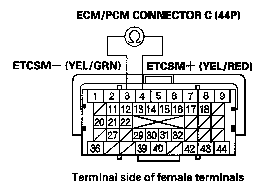 NO - Repair short in the wires between ECM/PCM connector terminals C3 (ETCSM- line) and C4 (ETCSM+ line), then go to step 7.