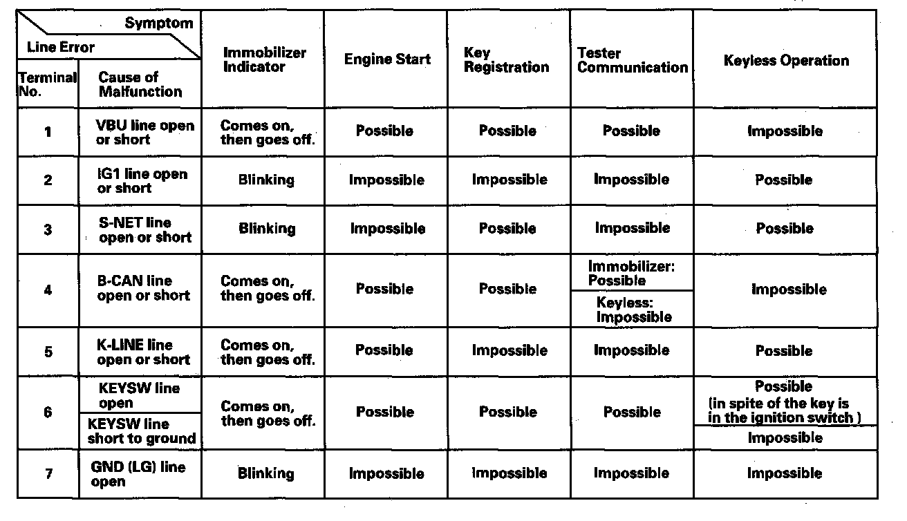 If a malfunction occurs in the immobilizer circuit for the VBU, IG1 and GND (LG) lines, identify the lines to check with this table.