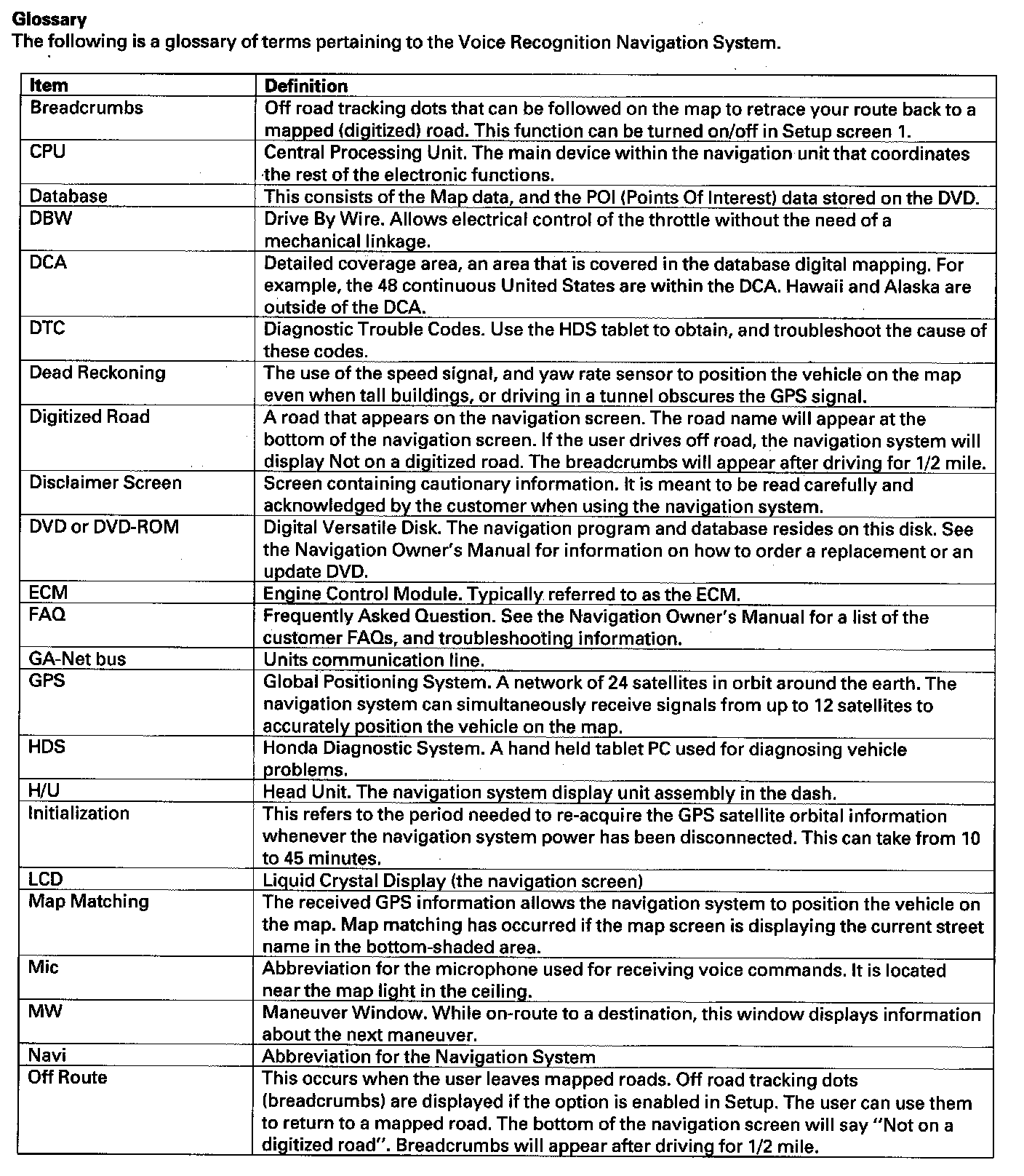 The Navigation System Manual in the glove box covers all of the system functions and settings. Use this as a resource when evaluating a customer concern.