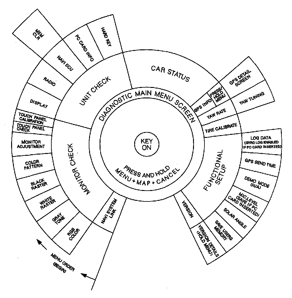 This diagram below shows an overview of the navigation diagnostic features starting at the center and working outward in layers. The diagram starts with "Key On." Next the diagram shows two ways to get the diagnostic main menu: