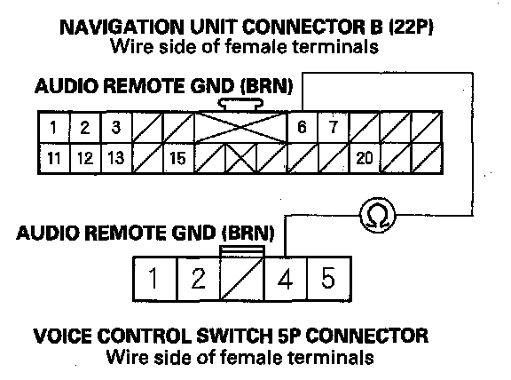 9. Check for continuity between navigation unit connector B (22P) terminal No. 6 and voice control switch 5P connector terminal No. 4.