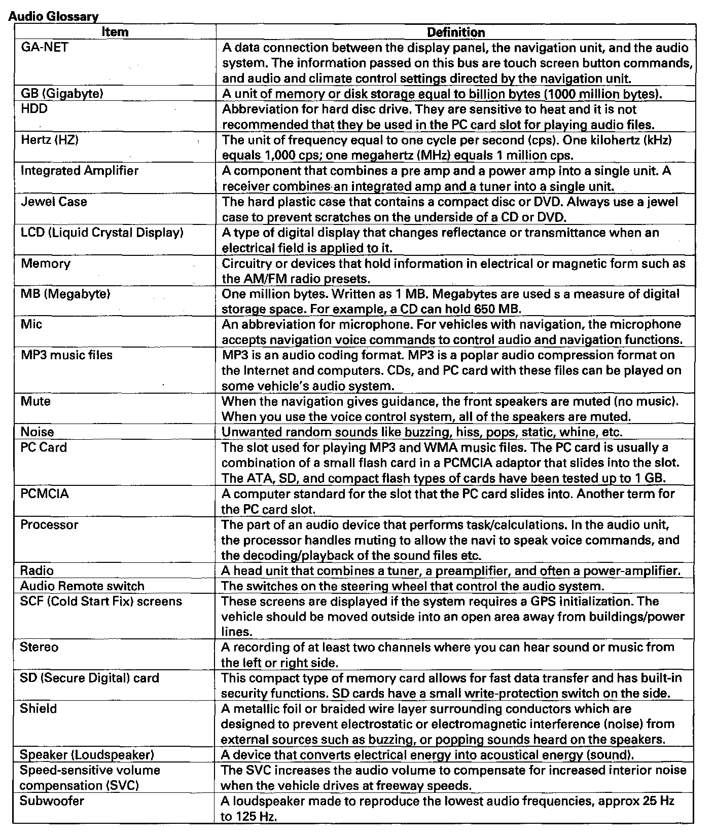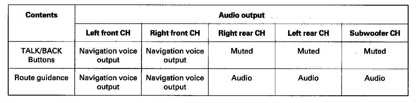 The navigation system allows voice control of the audio, XM, PC card, and CD player. Voice control commands are communicated on the GA-Net (audio unit). When using the TALK/BACK button, the audio is muted on all speakers and you get navigation sound on the front channels. When using the navigation or route guidance (RG), the front speakers give the navigation sound and the rear speakers continue to play. For more information, see the navigation section. The outline of the interruption function is shown in this table.