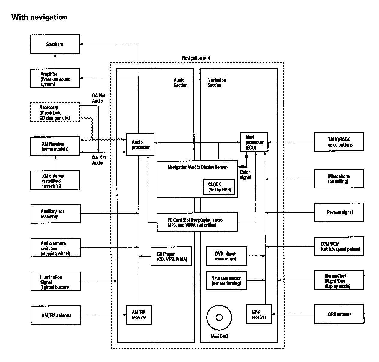 The GA-Net bus passes audio and navigation commands throughout the navigation and audio components. These commands include navigation touch screen and hard button signals, audio/XM selections by voice, and XM station and music title names. Because the entire bus is daisy chained between components (see diagram), any open or short in the GA-Net bus harness will cause any or all of these functions to become inoperative. Naturally the addition of any audio accessory must maintain the continuity of the GA-Net bus by installing the Y cable included with the accessory