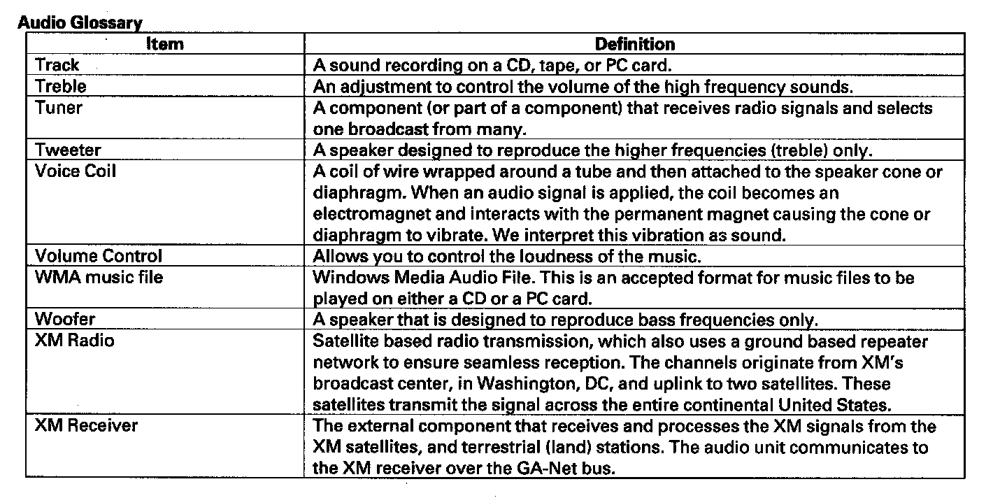 The XM receiver passes its signal to the audio unit. In addition, it communicates with the audio unit via the GA-Net bus. Any open connections in the GA-Net bus circuit causes audio and navigation functions to appear inoperative.