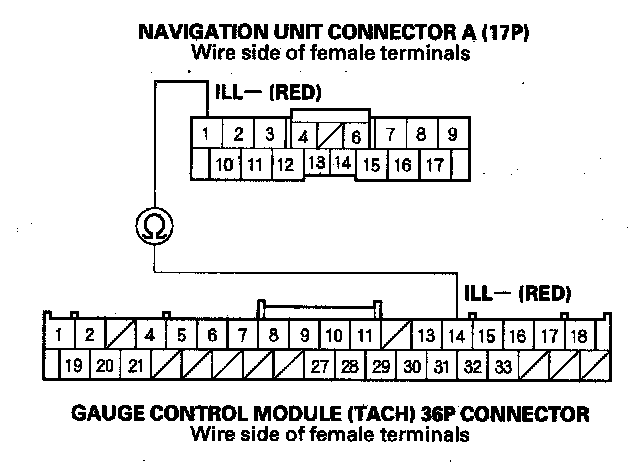 8. Check for continuity between navigation unit connector A (17P) No. 1 terminal and gauge control module (tach) 36P connector No. 14 terminal.