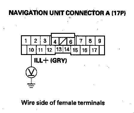 10. With the headlight switch still on, measure the voltage between navigation unit connector A (17P) No. 10 terminal and body ground.